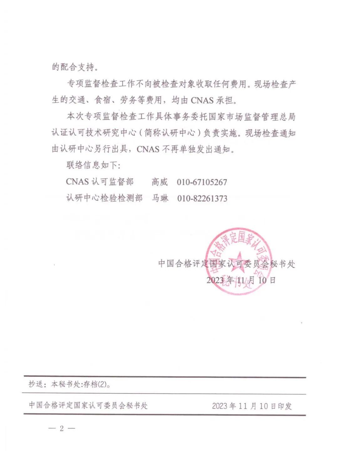 该通知规定本次专项监督检查工作具体事务委托国家市场监督管理总局认证认可技术研究中心负责实施;专项监督检查工作不向被检查对象收取任何费用。现场检查产生的交通、食宿、劳务等费用,均由CNAS承担。