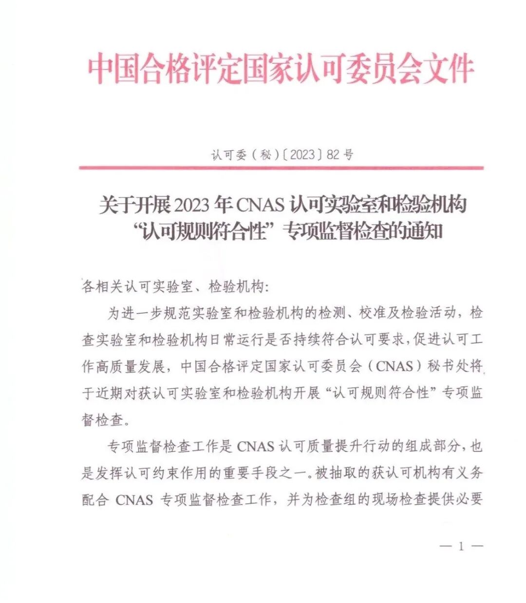 今日,CNAS发布了《关于开展2023年CNAS认可实验室和检验机构“认可规则符合性”专项监督检查的通知》(认可委(秘)〔2023〕82号)。通知主要内容为CNAS近期将对已获认可实验室和检验机构开展“认可规则符合性”专项监督检查。
