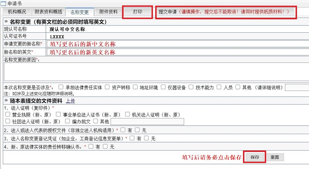 填写更名后的新中英文名称、名称变更的原因等内容(*是必填信息),上传相关附件资料,确认无误后请务必点击保存;保存后点击“打印”,导出变更申请书及所需附表,打印、签章、扫描后上传“附件资料”相应位置;导出完成后,点击“提交申请”提交变更任务。