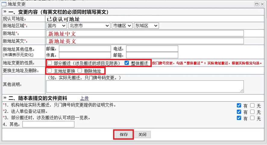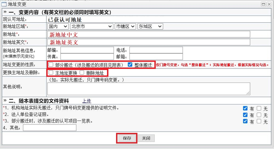 填写变更后的新中英文地址、新地址其他信息等内容(*是必填信息)。上传相关附件资料,确认无误后请务必点击保存;保存后点击“打印”,导出变更申请书及所需附表,打印、签章、扫描后上传“附件资料”相应位置;导出完成后,点击“提交申请”提交变更任务。