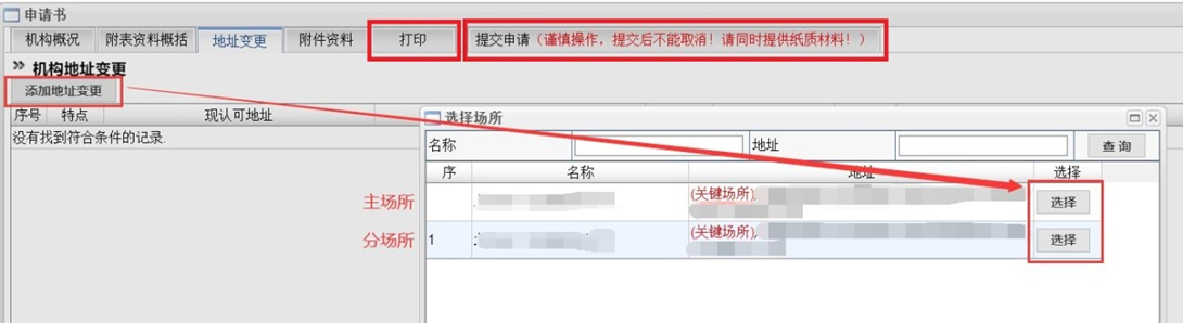 将“附表资料概括”里附表2勾选“是”,显示框点击“确定”后进入地址变更操作页面。页面左上角选择“添加地址变更”,弹出“选择场所”的页面,选择需要进行地址变更的关键场所。
