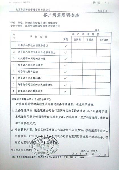 对贵公司提供的实验室认可咨询服务非常满意,在此表示感谢。