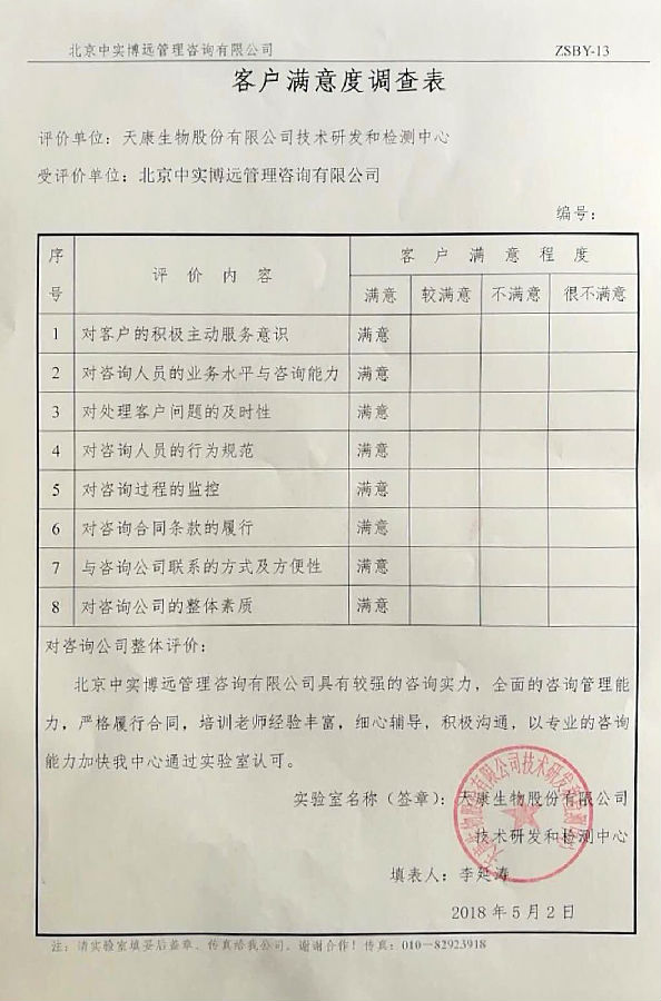 北京中实博远管理咨询有限公司具有较强的咨询实力,全面的咨询能力,严格履行合同,培训老师经验丰富,细心辅导,积极沟通,以专业的咨询能力加快我中心通过实验室认可。