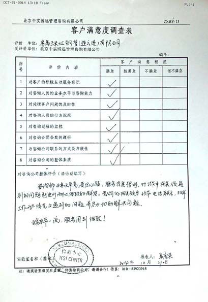 咨询师业务水平高,责任心强,服务态度很好。对工作中相关人员遇到的问题能进行耐心细致的解答。贵公司的相关领导经常电话联系,了解工作开展及遇到的问题,并尽力协助解决问题。
